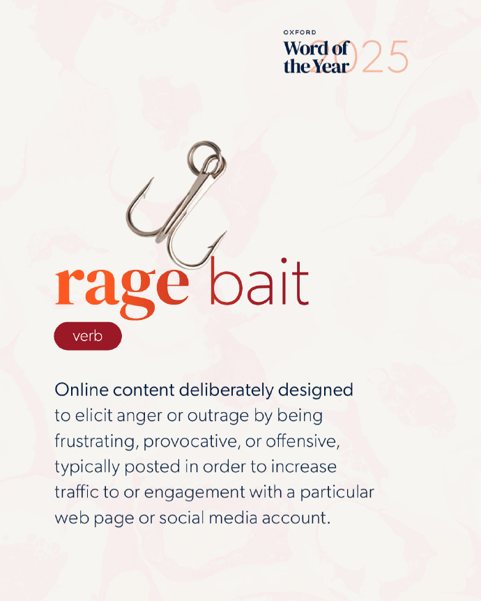 根据《牛津词典》官方定义,rage bait(名词)指故意设计成令人沮丧、挑衅或冒犯形式的在线内容,旨在引发愤怒或愤慨,通常是为特定网页或社交媒体账号引流、提升互动量。