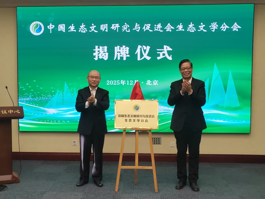 中国作家协会党组成员、书记处书记李一鸣(右一),中国生态文明研究与促进会会长张波(左一),共同为研促会生态文学分会揭牌