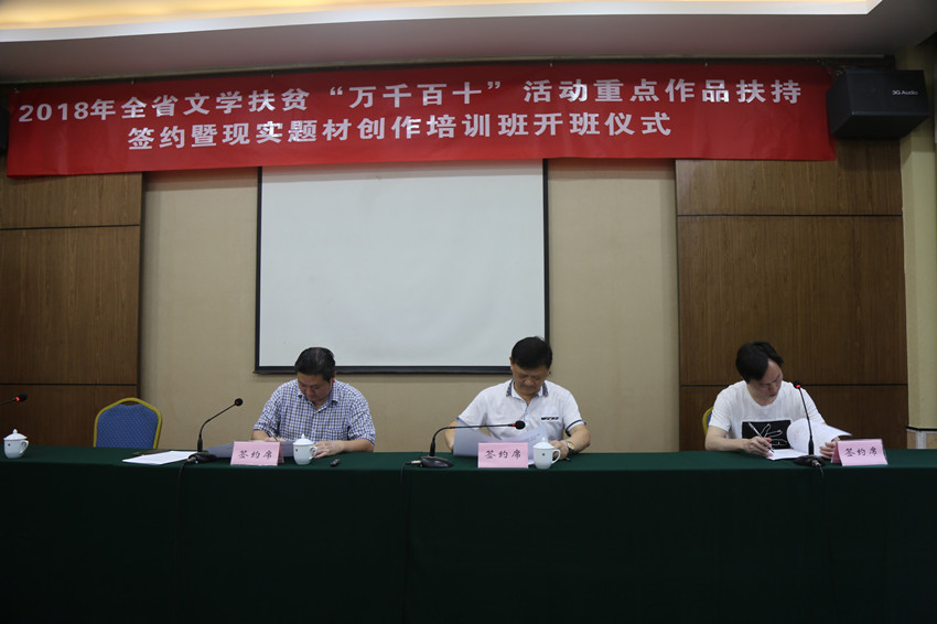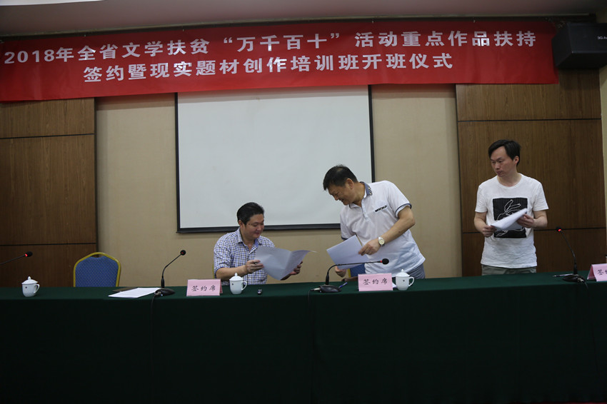 开班仪式中,四川省作家协会创联部主任邓子强宣读四川省作家协会公报(2018年第1号)2018年全省文学扶贫“万千百十”活动重点作品扶持选题名单,2018年全省文学扶贫“万千百十”重点作品扶持作品作家代表与四川省作家协会代表省作协党组成员、秘书长张渌波签订“万千百十”活动2018年重点扶持作品立项合同,2018年全省文学扶贫“万千百十”重点作品扶持作家代表及现实题材创作培训班学员代表也相继发言。