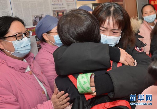 1月26日,在北京医院,同事拥抱送别援鄂抗疫医疗队队员(背红色背包者)。新华社发(彭子洋 摄)