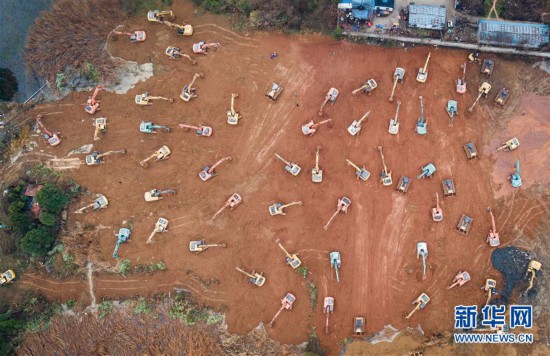 1月26日,在武汉雷神山医院建设工地,大型机械加紧施工(无人机照片)。新华社记者 肖艺九 摄