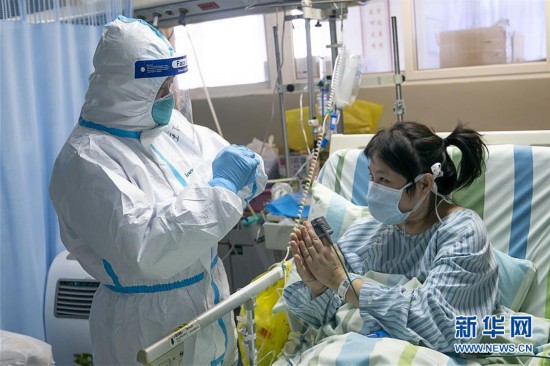 1月24日,在武汉大学中南医院重症隔离病房,中南医院重症医学科主任彭志勇(左)与病情好转的患者黄淑丽互道新春快乐。新华社记者 熊琦 摄