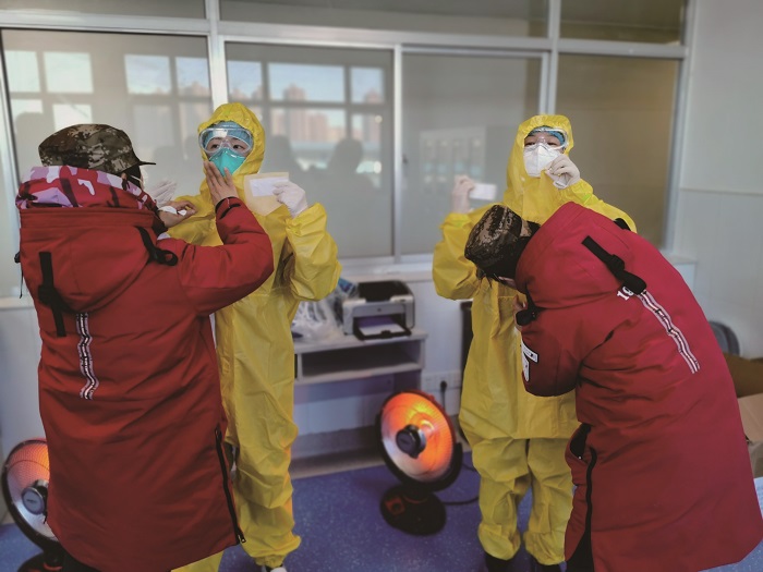 2月16日,辽宁省对口支援湖北襄阳医疗队队员、中国医科大学附属盛京医院的医护人员在穿戴防护装备,准备进入襄阳市中心医院病房开展工作。新华社发