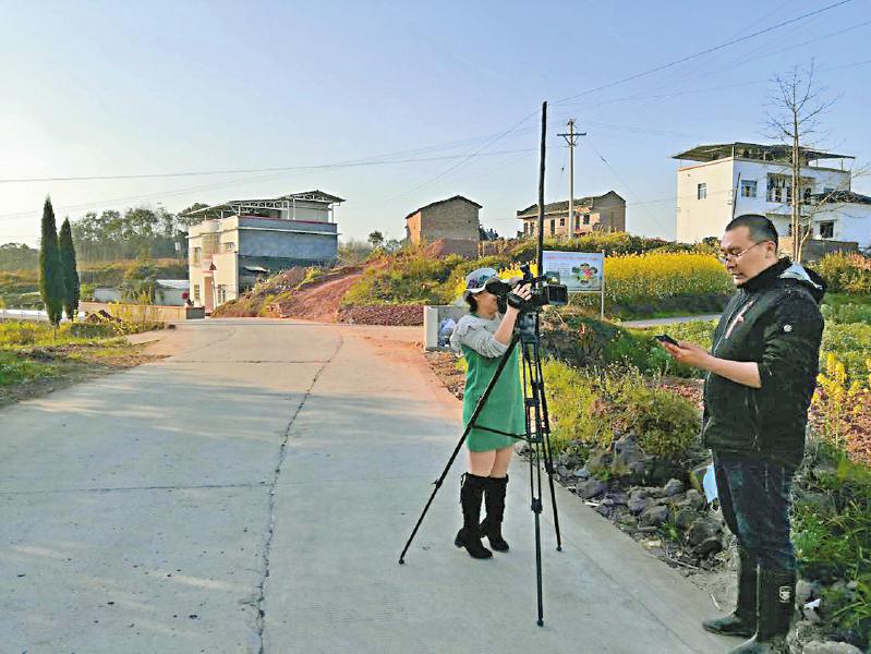 泸州市泸县奇峰镇宝丰村第一书记邓渊(右)在拍摄带货小视频。