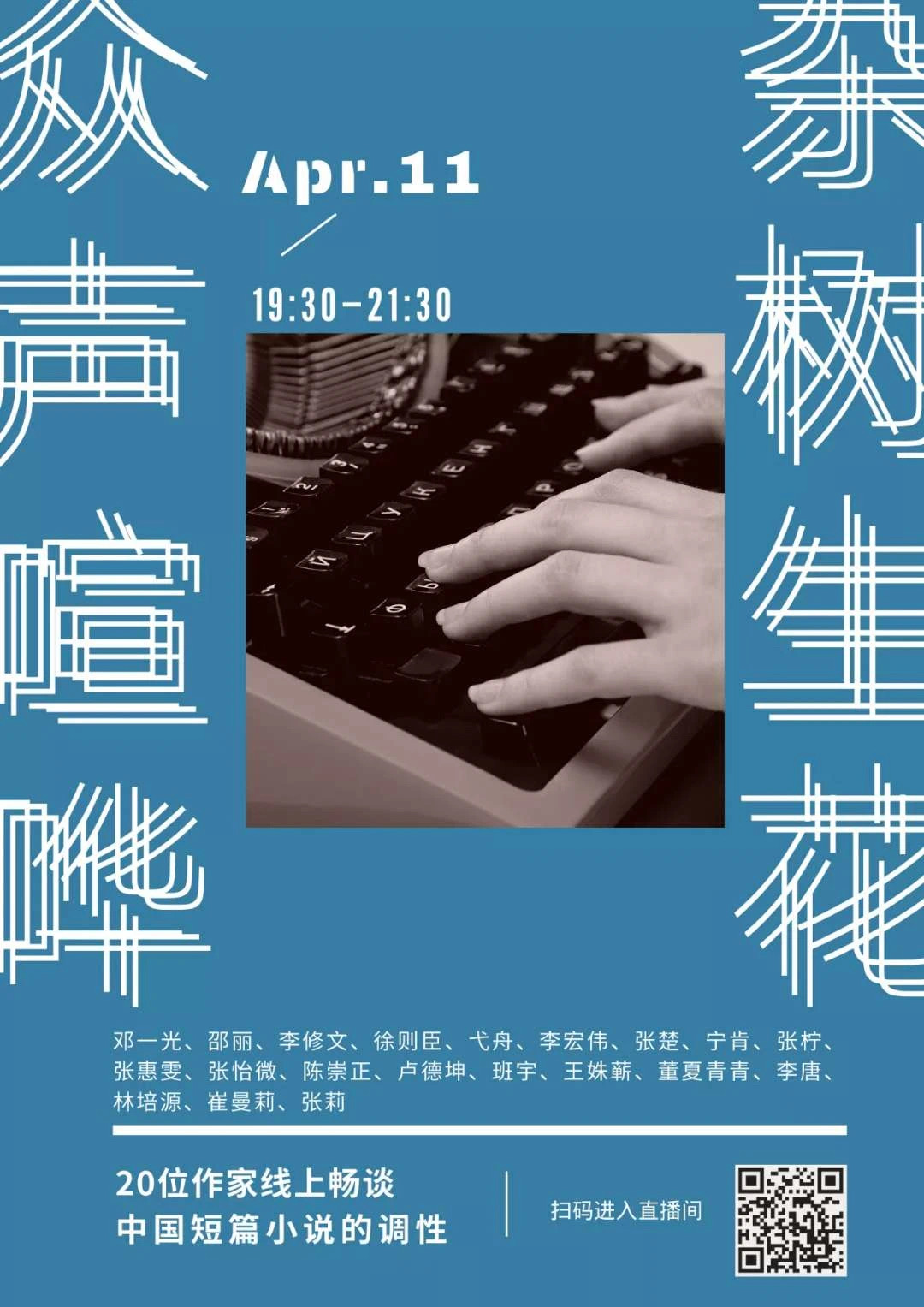 4月11日晚,“众声喧哗,杂树生花——20位作家云上畅谈中国短篇小说的调性”暨《我亦逢场作戏人:2019年中国短篇小说20家》新书发布会在腾讯新闻直播。文学批评家张莉与作家邵丽、李修文、徐则臣、弋舟、张楚、陈崇正、卢德坤、王姝蕲、林培源、崔曼莉在线畅谈中国短篇小说的调性。作家邓一光、李宏伟、张柠、张怡微、张惠雯、班宇、李唐也发来视频参与直播互动。这些作家年龄从“50后”到“90后”不等,代表了当下中国文坛的中坚力量。