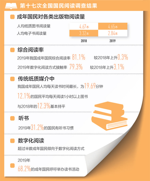 中国新闻出版研究院20日通过网络直播的方式公布了第十七次全国国民阅读调查的结果。数据显示,2019年我国成年国民各媒介综合阅读率保持增长势头,但纸质图书和电子书的阅读量有所下降。