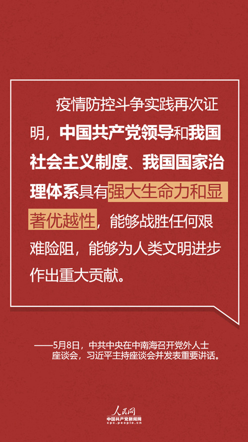 【编者按】5月8日,中共中央在中南海召开党外人士座谈会,就新冠肺炎疫情防控工作听取各民主党派中央、全国工商联和无党派人士代表的意见和建议。中共中央总书记习近平主持座谈会并发表重要讲话。这次会议上总书记有何最新判断和重要部署?人民网·中国共产党新闻网为您梳理。