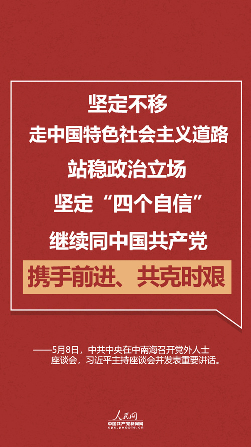 一是坚定不移走中国特色社会主义道路,站稳政治立场,坚定“四个自信”,继续同中国共产党携手前进、共克时艰。