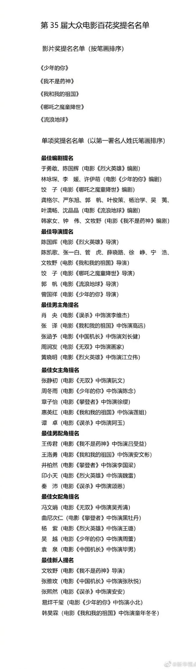 29日在京举行的2020年中国金鸡百花电影节暨第35届大众电影百花奖新闻发布会上,揭晓了本届百花奖提名名单,《我不是药神》《哪吒之魔童降世》《流浪地球》《我和我的祖国》《少年的你》获最佳影片提名。