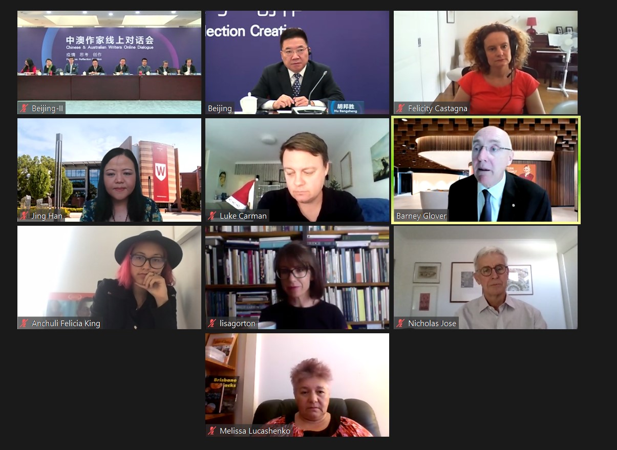 12月10日,由中国作家协会和澳大利亚西悉尼大学共同主办的“中澳作家线上对话会”举行。中国作协副主席阎晶明,西悉尼大学校长葛班尼,中澳文学交流使者尼古拉斯·周思,中国作家徐则臣、周晓枫、韩松、唐家三少、霍俊明、鲍尔金娜,澳大利亚作家梅丽莎·卢克申科、丽莎·戈顿、费利西蒂·卡斯塔尼亚、卢克·卡曼、金婉婷等参加对话会,两国作家围绕着“疫情·思考·创作”这一主题展开交流。对话会由中国作协书记处书记胡邦胜主持。