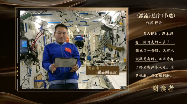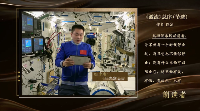 11月14日晚,由董卿主持的央视金牌栏目《朗诵者》第三季在央视一套黄金档播出。本期节目最大看点是“太空出差”近一个月的神舟十三号乘组王亚平、叶光富、翟志刚,漂浮于空间站之中,凝望着蓝色家园,深情地朗读了川籍作家巴金先生的《激流三部曲》总序。