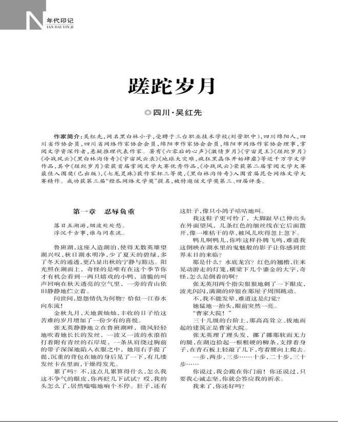 近日,中国微型小说会员、四川省作家协会会员、四川省网络作家协会会员吴红先创作的39 万字长篇小说《蹉跎岁月》在《今古传奇》(2024年8月末,总第752期)全文发表。《蹉跎岁月》曾在掌阅文学连载并获首届掌阅文学大赛奖。