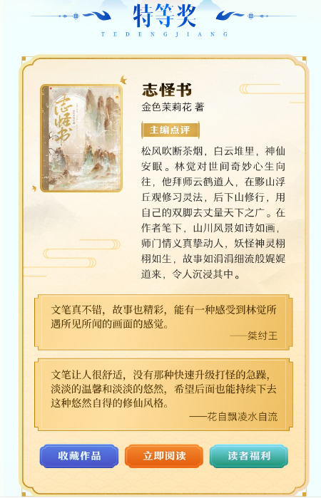 四川省网络作家协会常务理事金色茉莉花作品《志怪书》在2024黄山主题征文大赛中荣获特等奖!同时该作品在第四届石榴杯征文中获奖,并将被中国民族文化资源库收录。