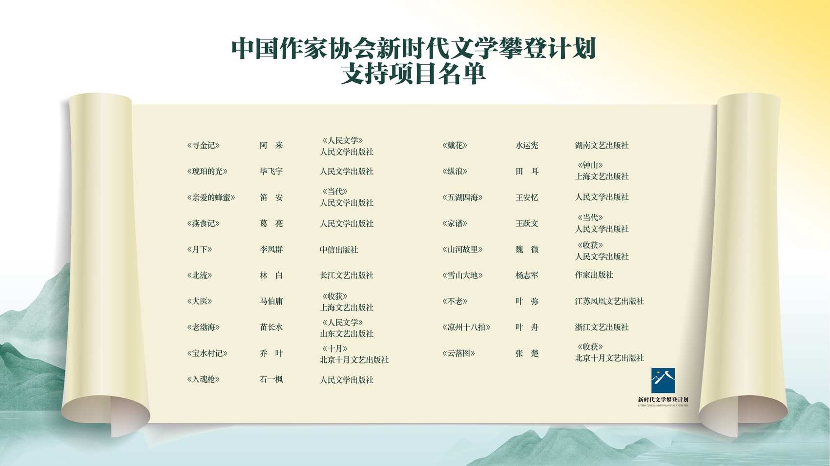 据了解,“新时代文学攀登计划”总发起人为中国作家协会,共同发起人包括人民文学出版社、上海文艺出版社、山东文艺出版社、中信出版社、中国青年出版社、长江文艺出版社、北京十月文艺出版社、四川文艺出版社等文艺类出版社,《人民文学》《十月》《中国作家》《当代》《江南》《收获》等文学期刊。