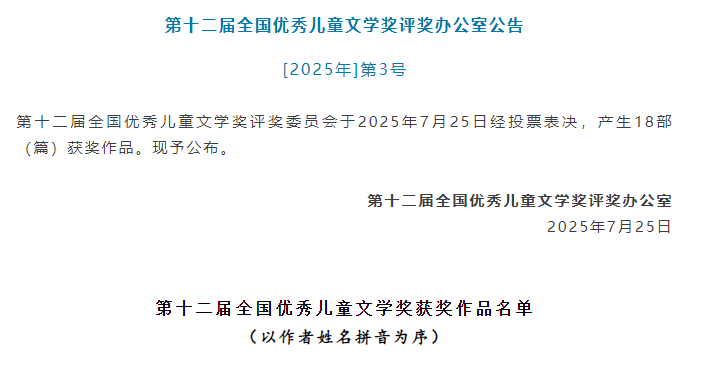 据悉,全国优秀儿童文学奖每三年评选一次,是我国具有最高荣誉的文学奖项之一,由中国作家协会主办,旨在鼓励优秀儿童文学创作,表彰优秀儿童文学作品,推动儿童文学事业繁荣发展。