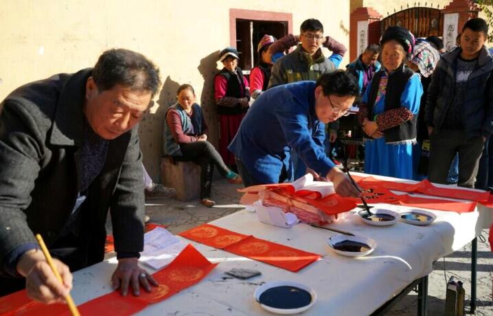 由阿坝州文联副主席王庆九带队,组织了摄影家、书法家和文艺志愿者20余人,先后深入理县朴头乡朴头村关口组和桃坪乡桃坪村、茂县永和乡腊普村和三龙乡纳呼村、汶川县雁门乡通山村和龙溪乡阿尔村,给广大高半山藏羌群众免费拍摄、打印和赠送全家福照片500余张,免费书写和赠送春联650余幅、福字300余张,不仅给偏远山村的藏羌群众送去了党和政府的温暖,还为他们脱贫致富的鼓劲助威,增强了他们学习贯彻十九大精神的热情和撸起袖子加油干、团结一心奔小康的信心和决心。