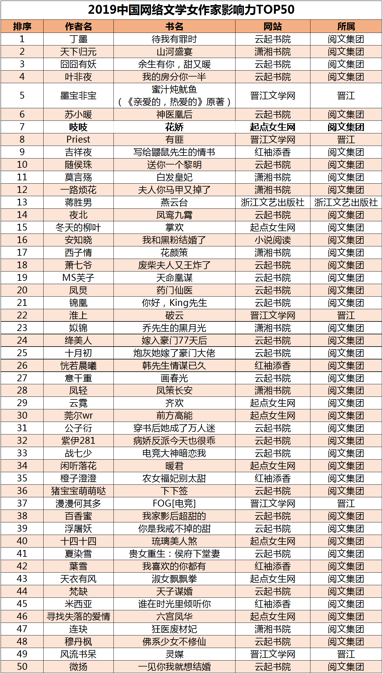 2019年中国网络作家影响力榜男作家TOP50及女作家TOP50