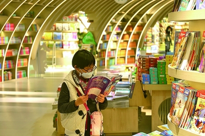 临近读书日,位于北京三里屯的Page One书店开门不久,就迎来了一对母女读者。她们安静地测完体温、登记完身份,走向书架,选阅自己喜爱的书籍。在二楼童书区,已有一对母子席地而坐,迎着窗外透进来的光,安静地读书。