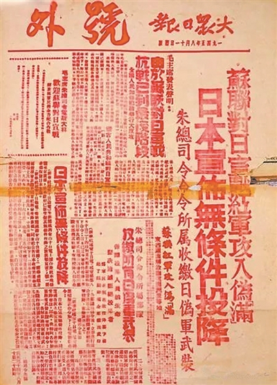 8月11日,山东解放区的《大众日报》出版单张整版套红号外,版面右侧赫然印有一行大字标题:“日本宣布无条件投降”;内容由《毛主席发表声明:由于苏联对日宣战,抗战已到最后阶段》《朱总司令命令所属部队收缴所有日伪军武装》《苏联红军攻入伪“满”》《日本宣布无条件投降》等相关报道组成。
