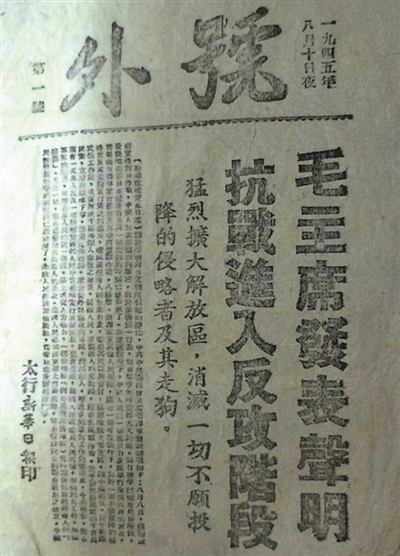 1945年8月10日夜,《新华日报·太行版》出版发行了第1号号外,主题为:“毛主席发表声明,抗日进入反攻阶段”;副题为:“猛烈扩大解放区,消灭一切不愿投降的侵略者及其走狗”;内容为毛主席声明全文。接着,其又出版发行第2号号外,主题为大号黑体字:“日本宣布无条件投降”;内容为:“(新华社延安十日急电)美新闻处旧金山10日电,据合众社本晚接获东京广播,日本政府已接受促其无条件投降之波茨坦宣言,唯一要求为保有日本天皇……”8月11日,《新华日报·太行版》又出版发行第3号号外,主题为:“朱总司令发布命令”;副题为:“各解放区一切抗日武装部队立即出动,收缴日伪军全部武装,接洽受降”;全文转发朱德总司令于8月10日发布的大反攻第一号命令。