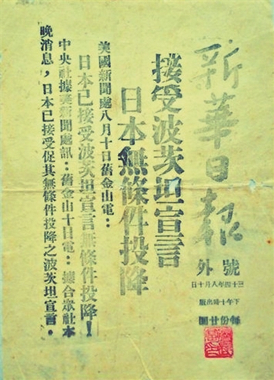 8月10日晚10时,重庆《新华日报》发出号外,援引国内外通讯社的报道说:“日本已接受波茨坦宣言无条件投降!”寥寥十几个字,将中国军民前仆后继、赴汤蹈火14年而取得的重大胜利的喜讯及时地报道出来。