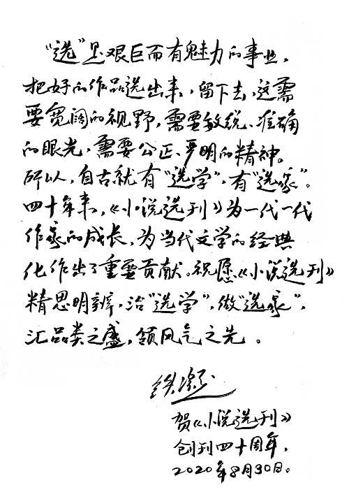 “选”是艰巨而有魅力的事业,把好的作品选出来,留下去,这需要宽阔的视野,需要敏锐、准确的眼光,需要公正、严明的精神。所以,自古就有“选学”,有“选家”。四十年来,《小说选刊》为一代一代作家的成长,为当代文学的经典化作出了重要贡献。祝愿《小说选刊》精思明辨,治“选学”,做“选家”,汇品类之盛,领风气之先。