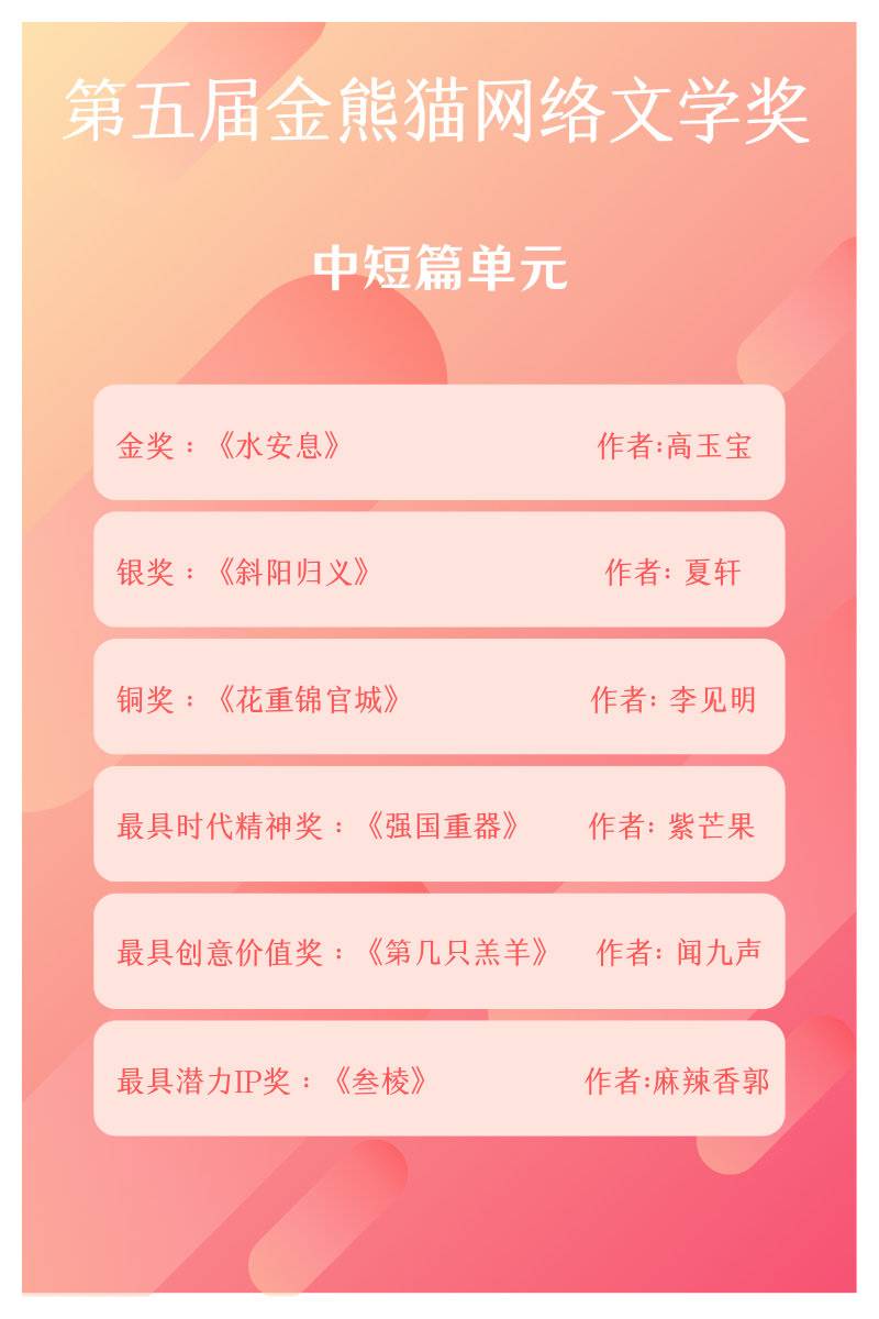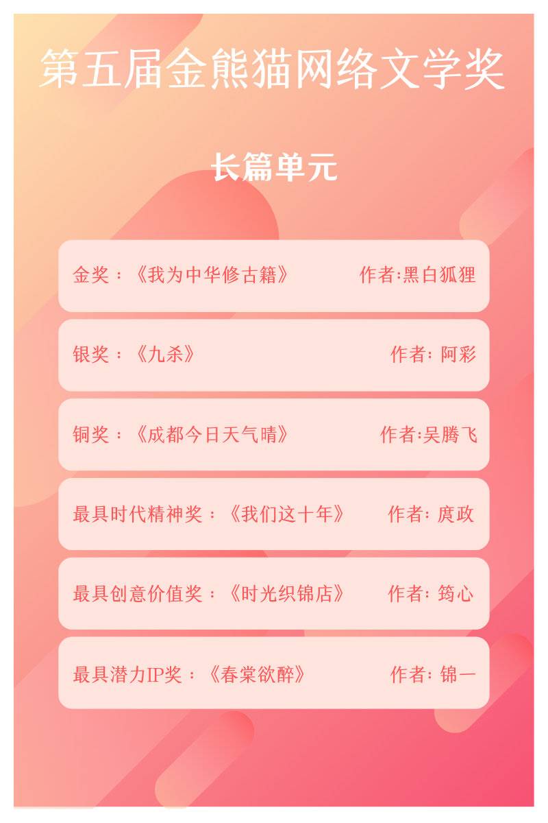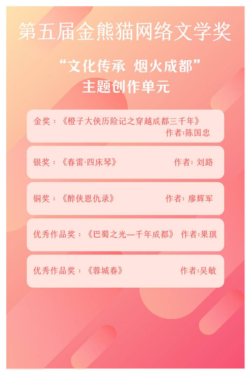 现场揭晓了第五届“金熊猫”网络文学奖获奖作品名单。本届“金熊猫”网络文学奖共征集322部作品,涵盖古典仙侠、现实百态、传统武侠、时空穿越等题材,最终角逐出17部获奖作品。其中,《我为中华修古籍》获第五届“金熊猫”网络文学奖长篇单元金奖,《水安息》获中短篇单元金奖,《橙子大侠历险记之穿越成都三千年》获“文化传承 烟火成都”主题创作单元金奖。此外,《我们这十年》《时光织锦店》《春棠欲醉》等作品分获最具时代精神奖、最具创意价值奖和最具潜力IP奖等奖项。