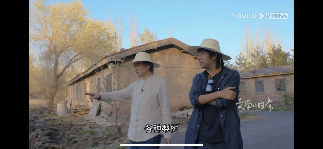 如今的刘亮程依然生活在乡下,是还做农活的作家。在他一手创办的木垒书院里,随处可见各类树木,凡是能在新疆存活的果树,都能在这间院落里找到,这是对山野生活的熟稔热爱。面对镜头,他很自然地肩扛铁锹,走在田地里,一边走一边随意就摘下几株苜蓿和蒲公英,塞进嘴里,一边品尝一边介绍说,“把叶子上虫子的卵处理一下就行”、“生吃比熟吃更好吃”。看到此,仿佛是在看《一个人的村庄》“现实生活版”。