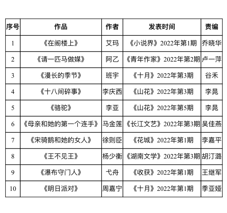 综合2022年1月至6月每期推荐的所有作品,经评审团再次推选、评议并投票,中国作家网“优选中短篇”半年榜出炉,以下为最终入选的十部作品(排名以作者姓氏拼音为序)。