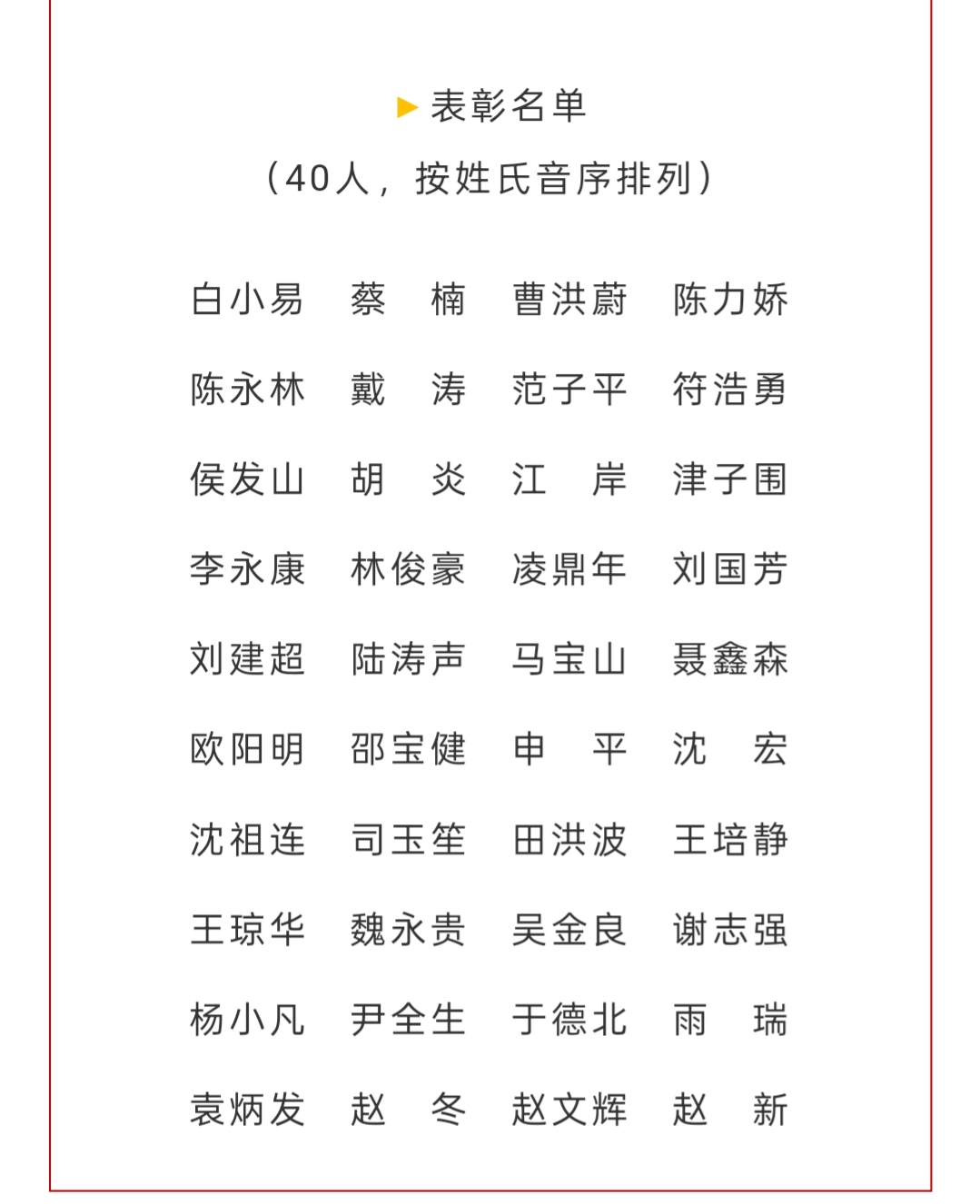 为庆祝《小小说选刊》创刊40周年,经《小小说选刊》编辑部评议,对自上世纪80年代创作发表小小说作品,曾获小小说金麻雀奖(含提名奖),而且至今仍然活跃在创作一线的40名作家,授予《小小说选刊》创刊40周年小小说创作40年奖章。