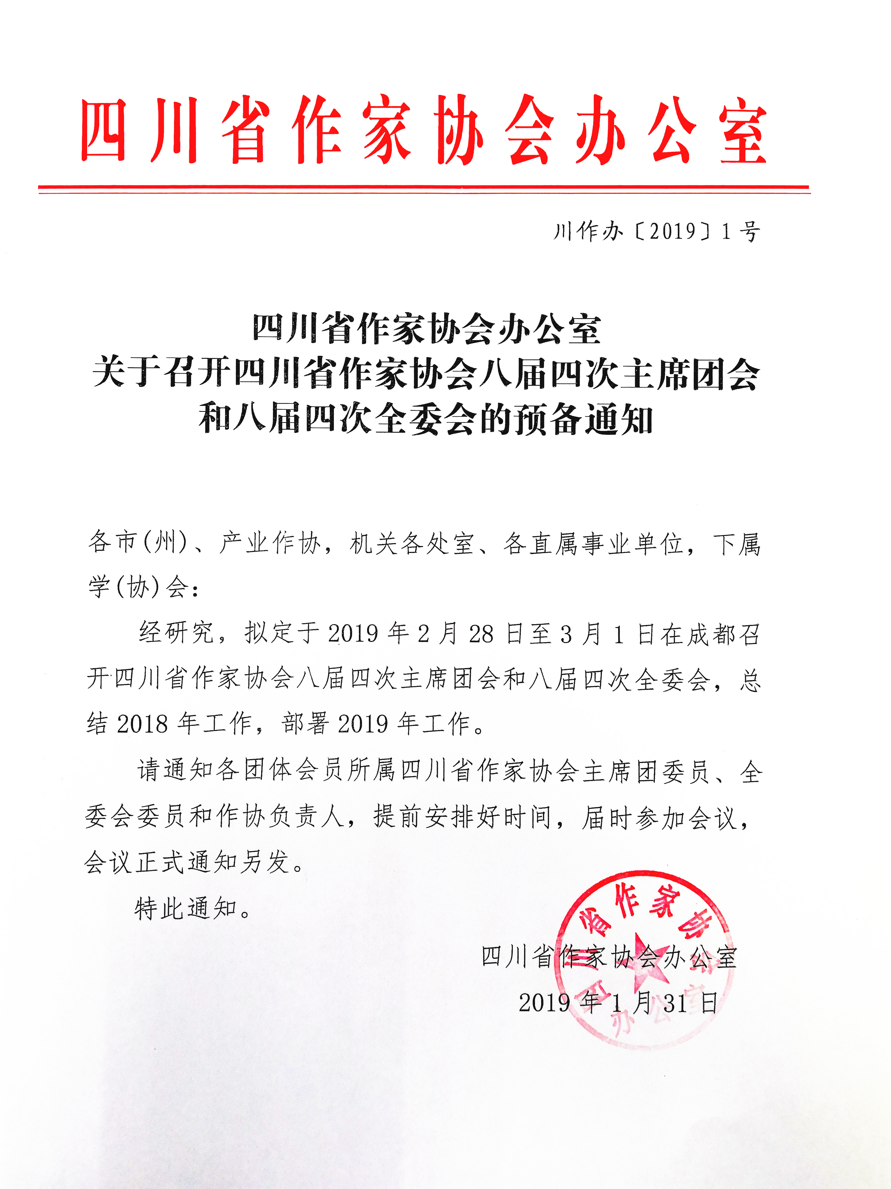 经研究,拟定于2019年2月28日至3月1日在成都召开四川省作家协会八届四次主席团会和八届四次全委会,总结2018年工作,部署2019年工作。
