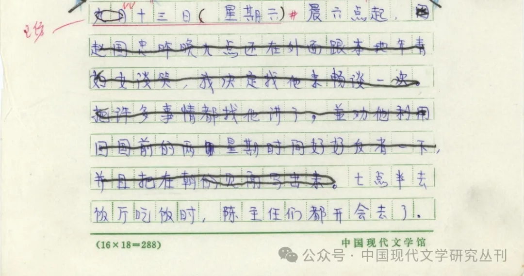 (2)1952年9月13日手稿为:“晨六点起,因赵国忠昨晚九点还在外面跟本地青年妇女谈笑,我决定找他来畅谈一次。把许多事情都对他讲了,并劝他利用回国前的两星期时间好好反省一下,并且把在朝的见闻写出来。”抄稿本在校改中删去句中有关赵国忠的内容,仅余“晨六点起”一句。