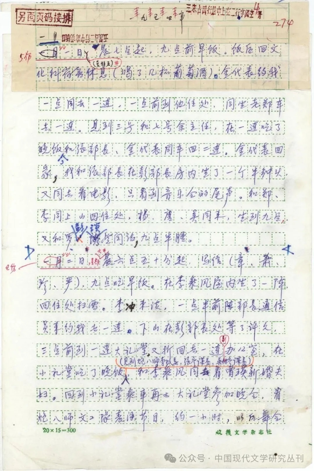 (二)抄件/抄稿本。抄稿本系方便日记文稿的编辑排版,巴金安排助手根据日记手稿原文抄录所成,使用方格文稿纸单面抄写,上有大量编校字迹和排版信息,并附页码和注释文字。《赴朝日记》(一),封面1页,正文共196页。根据抄录的笔迹来看,应有两人参与了抄录工作,根据抄稿右上角机印页码,5~70页和132~200页为同一人用蓝色圆珠笔抄录,正文71~131页为另一人用蓝黑色钢笔抄录。《赴朝日记》(二),封面1页,正文共78页。根据笔迹来看,也有两人参与抄录工作,根据抄稿右上角机印页码,202~218页由一人用蓝色和黑色圆珠笔抄录,219~279页为另一人用蓝色圆珠笔抄录。根据抄稿本的笔迹推断,应有多人(至少三人)参与了《赴朝日记》手稿的抄录工作。