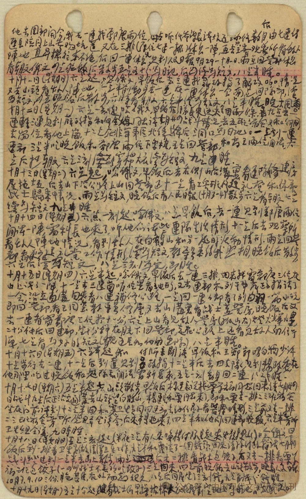 十月四日 星期六 昨夜睡得早,到十点半就醒了。披衣出去望月,月色很好,真想在外面多站一会。晨六点起,念俄文,去伙房参观,见到从七〇部来的炊事员老郭。早饭后和陈主任、汪部长、余科长同去司令部,翻了山,也不觉得十分吃力。见到李政委和曾副司令,在李政委房里坐了两三个钟头,听见七〇部二日的战斗获得全胜,捉了六十个俘虏,缴获轻重机枪各几挺的消息,很高兴。和李政委同去新建的抗美堂,坐了一阵,看同志们在布置欢迎祖国慰问团的会场。回来和陈主任下了四盘棋,晚饭时见到谢副参谋长和吴处长,喝了好几杯白葡萄和一杯半白兰地,饭后同去抗美堂,余科长先回政治部。我和陈主任、汪部长即由抗美堂直接回政治部。和李政委告别时,他说要记住十九兵团,我说我愿在十九兵团当一小兵。回到政治部,天刚黑,汪部长去看电影去了。我和陈主任到了住处,门都上了锁,无法进屋,陈主任约我同去看电影,看完《民主德国》,胡可和罗工柳两位同志来了。握了手,讲了两句话,因酒意未消,口渴难耐,和陈主任先□离会场,在他住处喝了两大碗茶,回住处不过七点半钟,余科长已灭烛睡了,即睡。