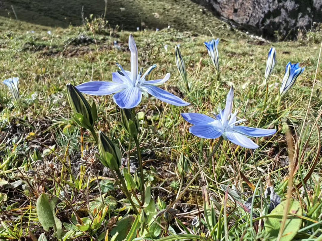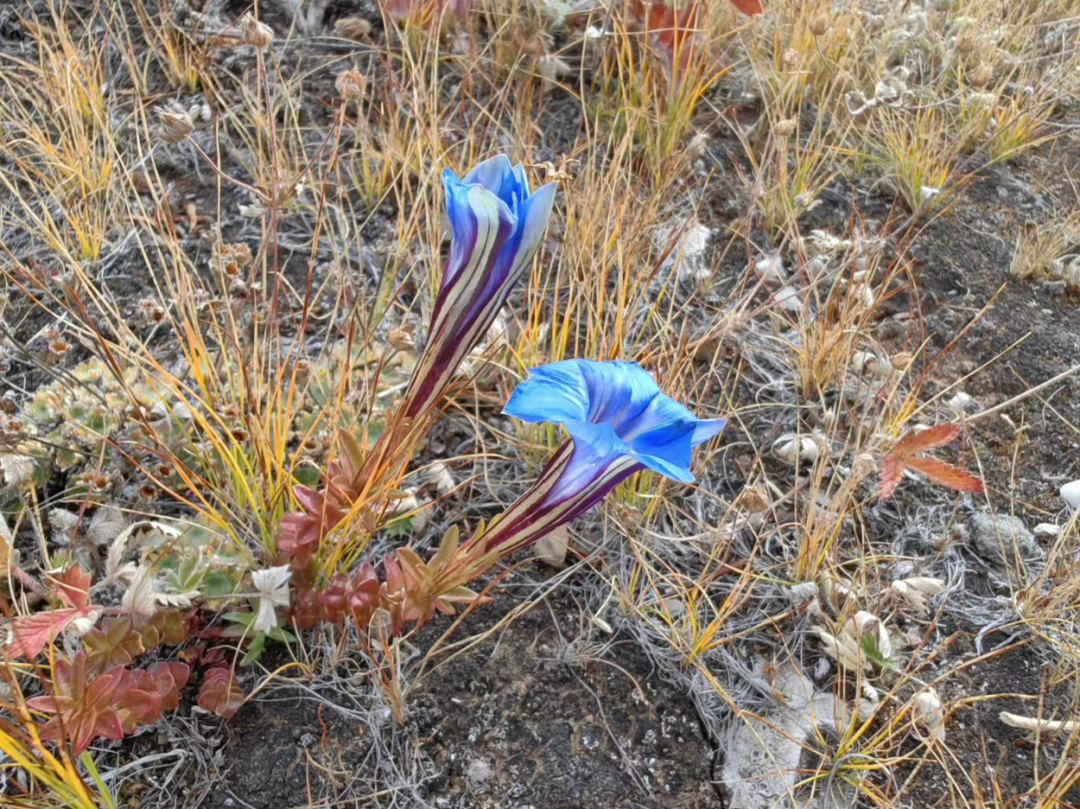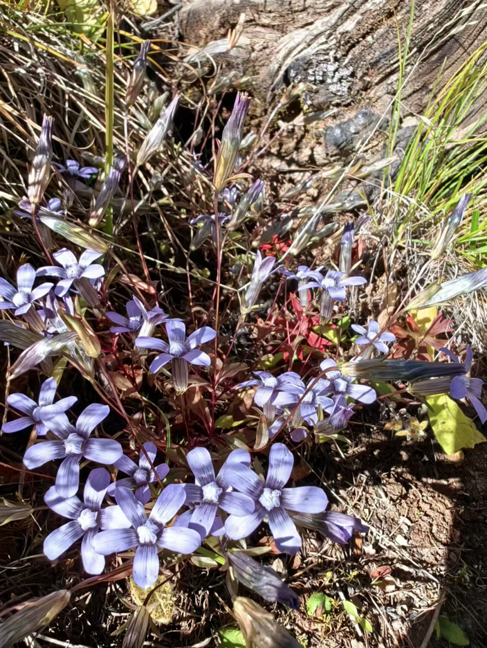 阿哥继续用他令人惊叹的博闻强记的植物学知识,图文并茂地为大家普及,高原上那些悄悄绽放的美丽。他说,这个蓝色的唢呐状的花朵是龙胆科的瘦华丽龙胆,这种淡紫色花瓣的是龙胆科的喉毛花,这种像芭蕾仙子的是龙胆科的肋柱花,还有这种黄色团状的是菊科香青属的某种香青,还有铁线莲,黄景天……我在感慨这些高原之花用它们依稀尚存的花影,顽强地生长出一年里最后的倔强,也丰满了季节之秋的同时,再次为未能奔赴的这场稻城之约而深深遗憾。