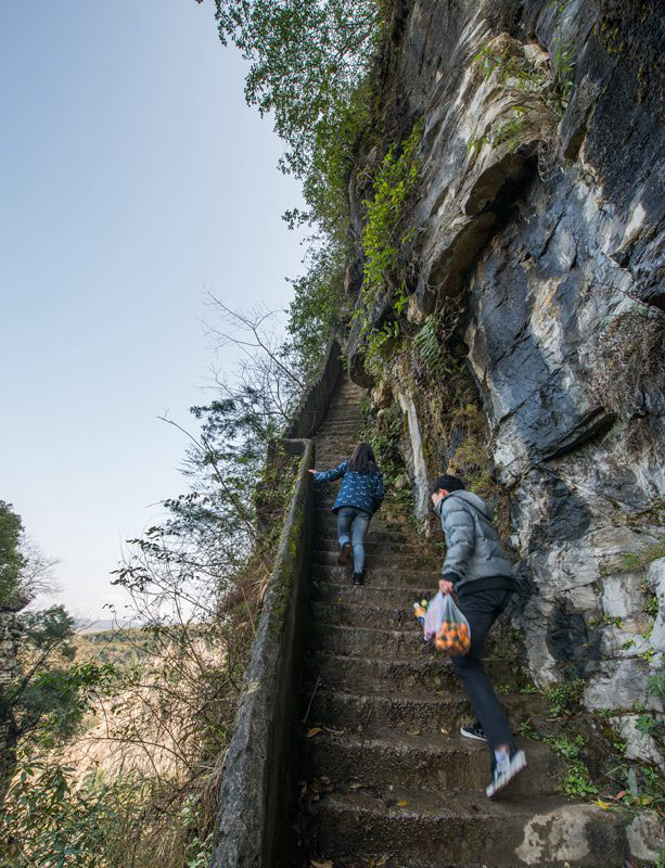 无路找路,眼前的悬崖峭壁,怎么上得去?这时,只见他的眼前一亮,就在石门不远处,一道悬空的木梯在风中摇晃着,看得出来,这是一道饱经风雨的上山的木梯,至于搭建于何时,概莫能知。据传,兵荒马乱年代,曾有人在山上屯兵养息;三十年代前后,曾经有两个村户在这里繁衍生活,后来不知所踪;山上尚存一破庙,因缺人迹,罕见香火。